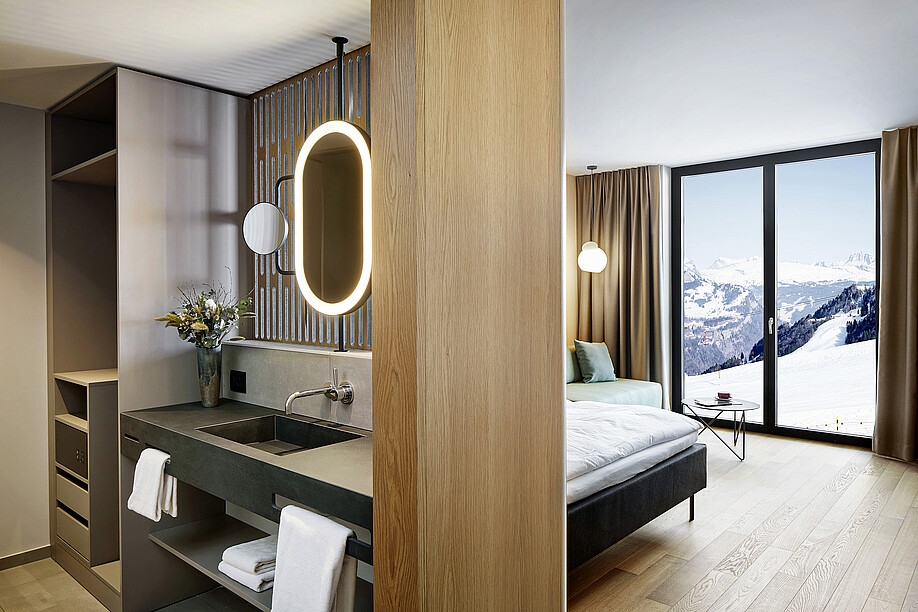 Die Stoos Lodge beendete die Ära des damaligen Hotel Klingenstock. Das in die Jahre gekommene Gebäude wurde zuletzt als Mitarbeiter-Unterkunft genutzt, eine Auffrischung stand an. «Die neue Stoosbahn ermöglichte uns ganz neue Möglichkeiten, weshalb wir das ursprünglich geplante Betriebskonzept nochmals überarbeiteten und auch die hohe Nachfrage nach Seminarangebot und Kurz-Auszeiten berücksichtigten», erklärt Bauherr René Koch. Entstanden ist ein modernes New-Generation-Hotel mit 101 Zimmern verschiedener Grösse bis zur Spa Suite, ein Sauna- und Fitnessbereich, Seminarräumlichkeiten mit Platz für bis zu 250 Personen sowie mit einem Gastronomiebereich, der sowohl den Hotel- als auch den Tagesgästen zugänglich ist.