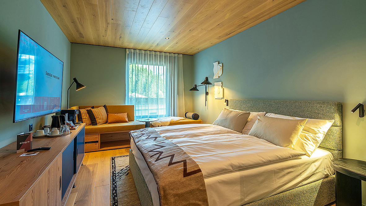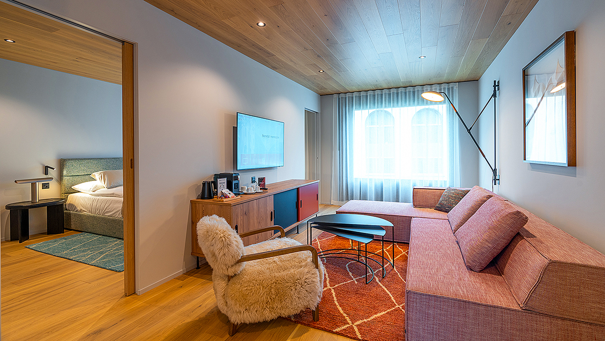 Das Hotel bietet 44 Lofts und Doppelzimmer, teilweise mit Kochnische, die zu geräumigen Einheiten für bis zu sechs Personen kombiniert werden können, sowie zwei Apartments. Herzstück ist die Mountain Lounge & Terrace. Dort spielt sich das Hotelleben der Gäste und Mitarbeitenden ab, beim Check-in, der Beratung über Aktivitäten, bei einem Glas Wein aus der Region oder einem Cocktail an der Bar, beim Sonne Tanken auf der Terrasse oder beim Lesen am Cheminée. Das reichhaltige Frühstück kann am verführerischen Büffet in der Lounge oder wenn gewünscht auf dem Zimmer genossen werden. Auch kleine Speisen wie Pinsas, Dumplings oder Suppen werden in der Mountain Lounge & Terrace angeboten. Wer in den «eigenen vier Wänden» kochen möchte, erhält im «Grab & Go Shop» regionale Zutaten.