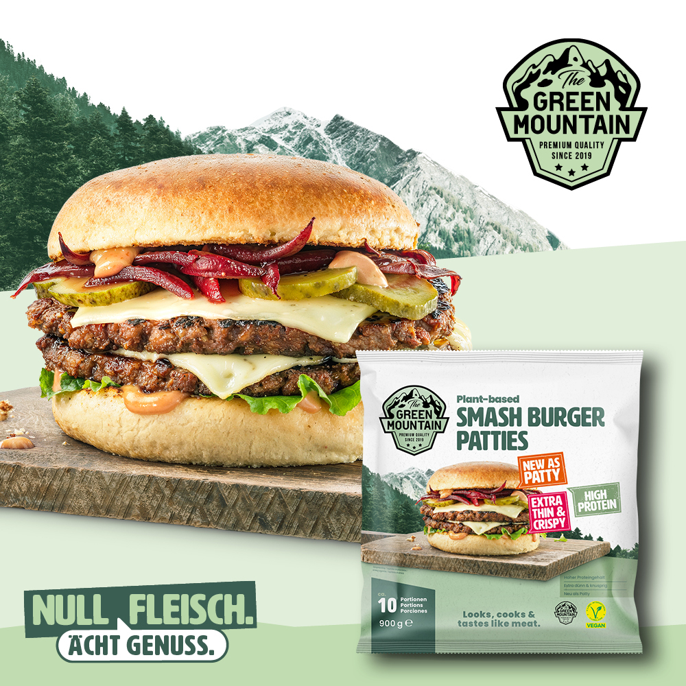 Nach dem Erfolg des ersten Plant-based Smash Burgers im Jahr 2024 bringt The Green Mountain mit dem neuen, vorgeformten Plant-based Smash Burger Patty die Weiterentwicklung des Originals auf den Foodservice-Markt und unterstreicht damit seine Burgerkompetenz.
