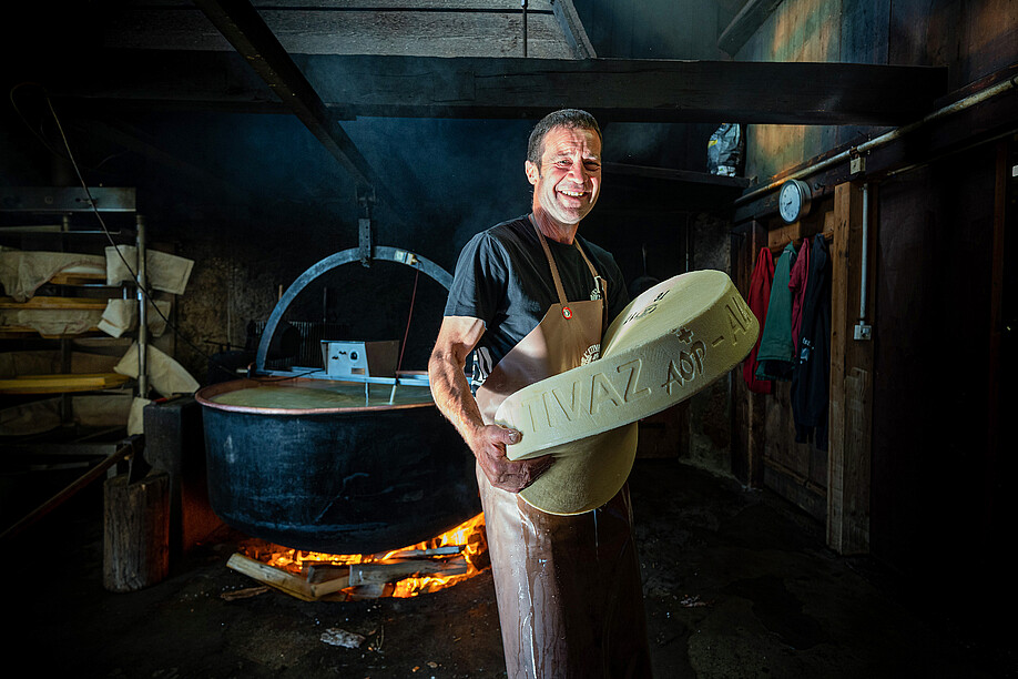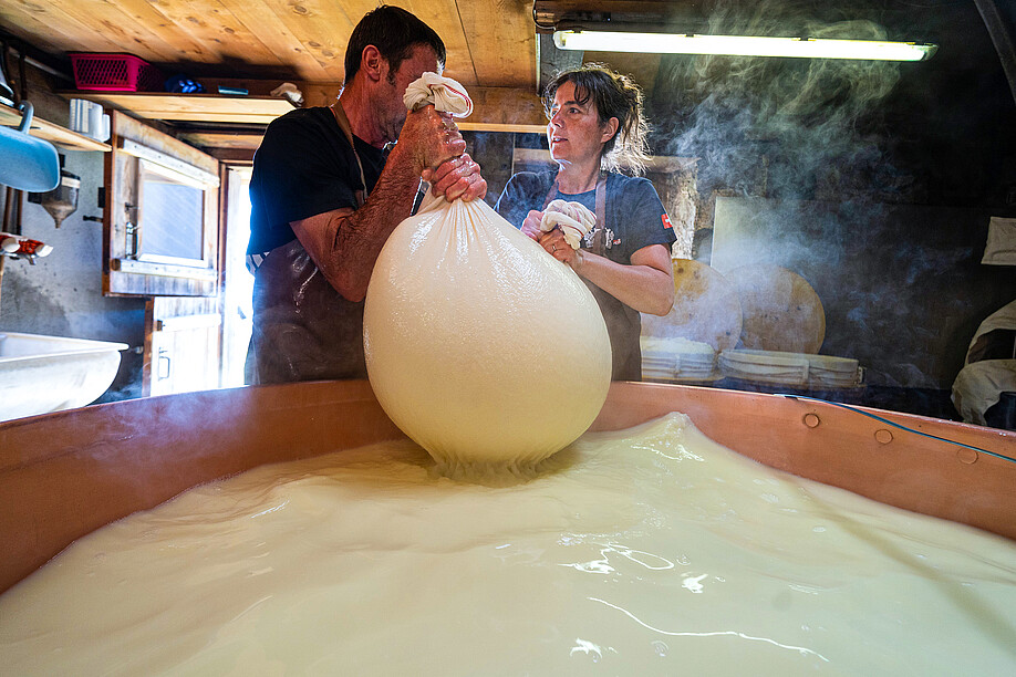 Was Alpschweine mit Käse zu tun haben? Sehr viel. Auf der Waadtländer Alp Les Chargiaux (Etivaz) zerschneiden François und Murielle Raynaud täglich 1400 Liter geronnene Milch mit der Käseharfe, heben den Käsebruch in einem eingespielten Kraftakt aus dem Kessi und pressen ihn in die vorbereitete Käseform. Zurück bleibt viel Molke, die kurze Zeit später in die Tröge der Alpschweine fliesst, welche hier oben ein saugutes Leben führen, bevor sie der Fleischproduktion zugeführt werden und ab September als Nierstück oder Krustenbraten der Marke Origine in den Prodega-Märkten im Kühlregal oder im Webshop von Transgourmet stehen.