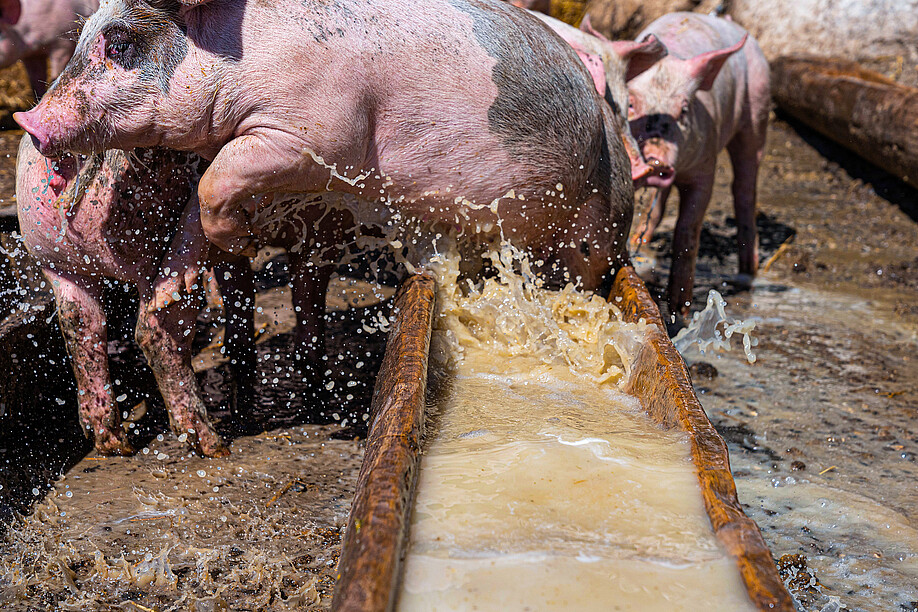 Die Linus Silvestri AG hat die Kombination von Schweinemast und Milchwirtschaft auf rund 60 Schweizer Alpen transferiert und die Definition des Tierwohls erweitert, das man sich an einem schönen Sommertag wie folgt vorstellen kann: Ein Grossteil der Alpschweine liegt faul auf ihrem strohweichen Massenlager, das mit einem Holzdach erstklassig überdacht ist. Ein paar Geniesser stecken ihre Nase in die frische Molke oder springen auch mal ganz rein, weil es so heiss ist. Die Schweine haben jederzeit freien Zugang zu einem 40 Quadratmeter grossen Naturbodenauslauf mit beneidenswerter Aussicht auf Alpen und Weiden. Der Boden ist garniert mit Steinen, Gras und Schlamm, mit allem, was ein Schwein für sein Glück braucht, das seine Nase gerne überall reinsteckt, nach Würmern und Samen gräbt und das tut, was es nebst Schlafen am meisten liebt: Im Dreck wühlen und schlammbaden. Das Schlammbad dient der Körperpflege, um sich abzukühlen, und als Sonnenschutz.