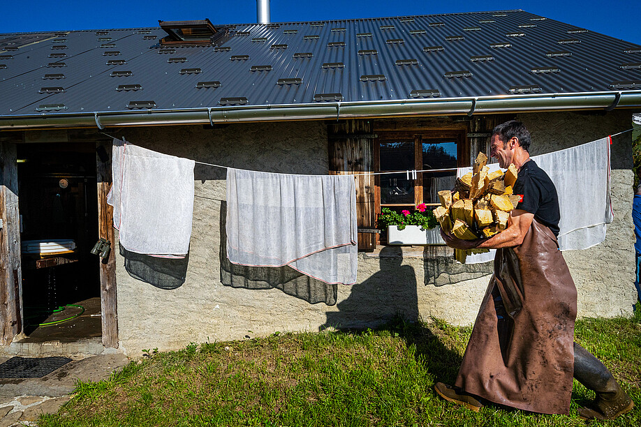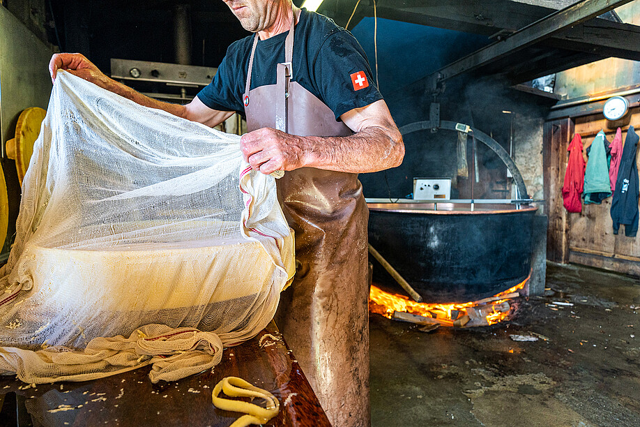 Konkret entstehen aus 100 Kilo Alpmilch zehn Kilo Alpkäse und 90 Liter Schotte. Sie bleibt im Kupferkessi zurück, nachdem der Käsebruch herausgehoben wurde. Doch zuerst mischt François Raynaud morgens die frisch gemolkene Milch mit jener vom Vorabend, reichert sie mit eigenen Milchsäurebakterien an und erhitzt sie über dem Holzfeuer auf 32 Grad. Das Feuer knistert, das morgendliche Sonnenlicht bricht durch Türe, Fenster und Ritzen herein, schneidet helle Kegel in das Dunkel der Alphütte. François Raynaud fügt das Lab hinzu, das aus dem Labmagen junger Kälber gewonnen wird. Nach einigen Minuten stoppt er das Rührwerk und lässt die Milch ruhen, «damit der Sud gerinnen kann», sagt er. Es riecht nach Feuer und nach angenehm säuerlich warmer Milch.