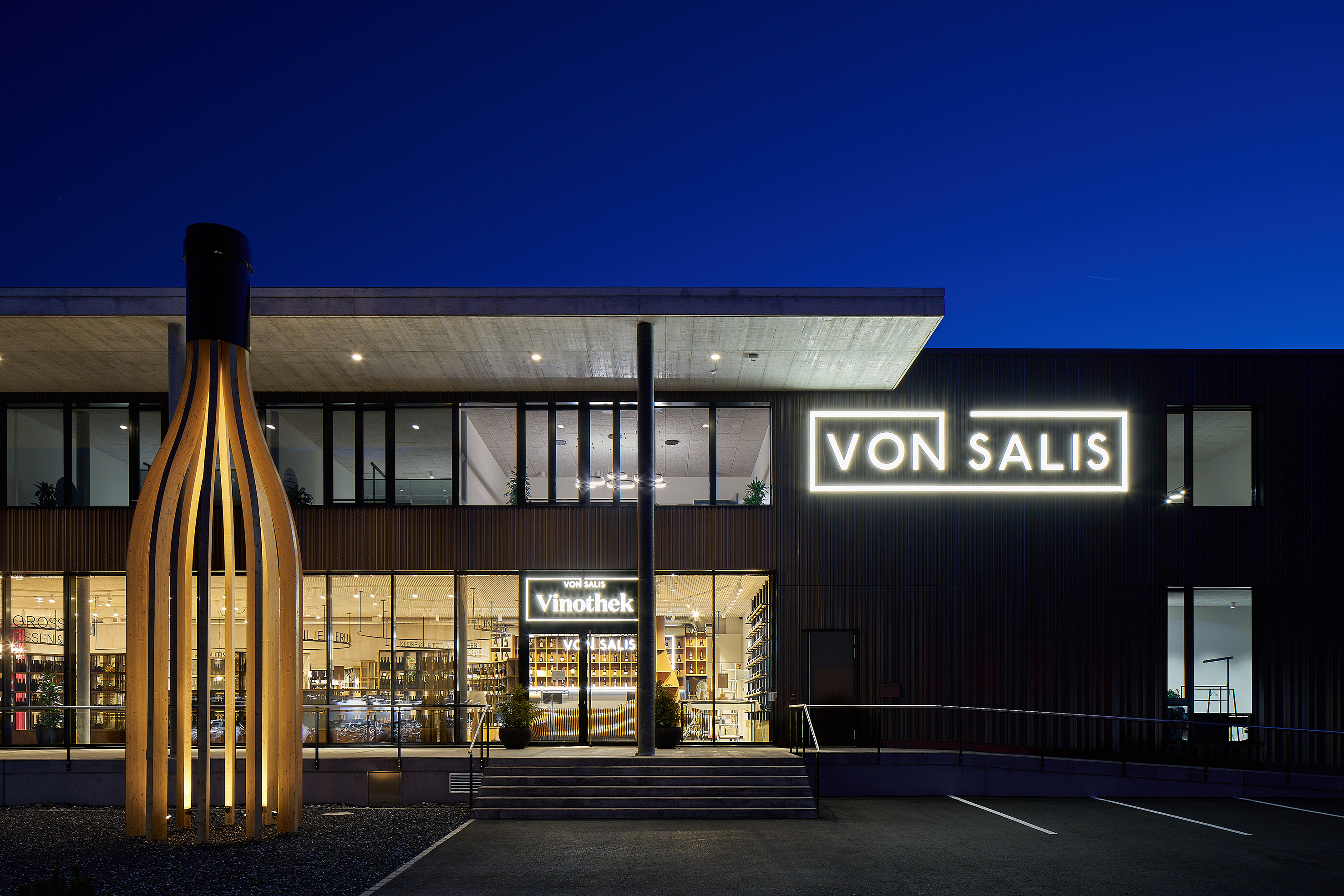 Nur eine Minute von der Autobahnausfahrt Maienfeld entfernt vereint der neue Standort Lager, Büros und eine grosszügige Vinothek unter einem Dach. Herzstück des Neubaus ist die lichtdurchflutete Vinothek mit hohen Decken, stilvoller Architektur und einem kuratierten Sortiment von von-Salis-Weinen, Weinen von über 20 namhaften Weingütern aus der Bündner Herrschaft sowie Weinen aus ganz Europa. Sie ist nicht nur Verkaufs- und Beratungsraum, sondern Bühne für den Wein: Ob Degustationen, Firmenanlässe oder Schulungen, die neue Vinothek lädt ein zum Entdecken, Erleben und Geniessen.