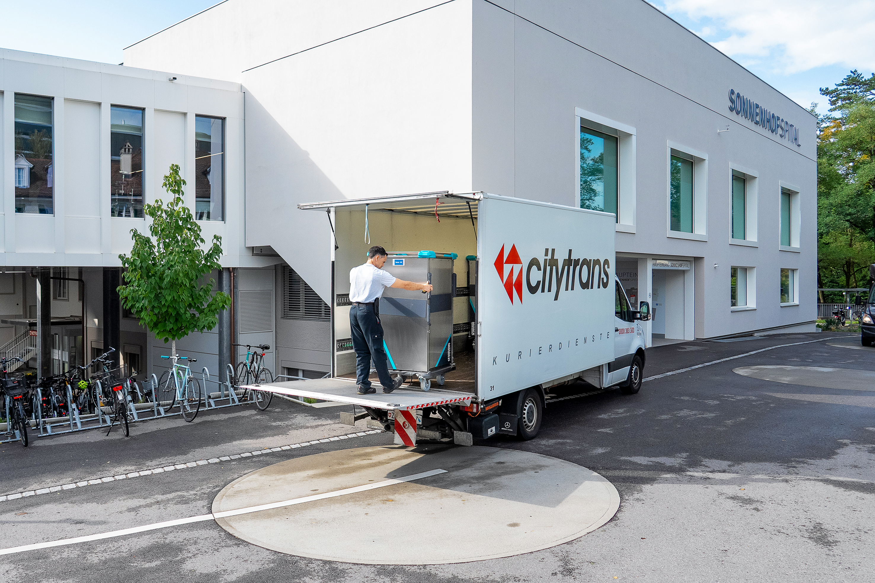 Das gilt auch für die Doubleflow-Ergoserv-Wagen im Engeried. Sie basieren auf einer entkoppelten Lösung. Das heisst, die temperaturstabilen Wagen werden im Sonnenhof mit kalten Mahlzeiten beladen. Ohne elektrische Bauteile sind diese kompakt, robust und leicht – ideal für den Transport durch Citytrans, den Logistikpartner, der die Mahlzeiten für den Mittags- und Abendservice zweimal täglich ins nahegelegene Engeried transportiert und Leergüter retourniert. Dies ermöglicht einen effizienten und zuverlässigen Ablauf zwischen den Standorten.