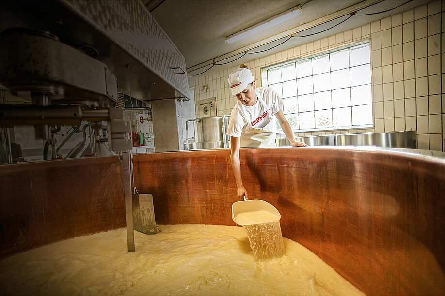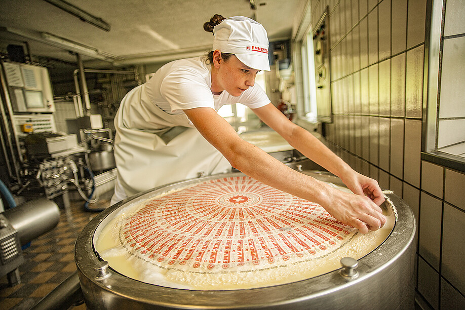 In rund 110 sorgfältig ausgewählten Schweizer Käsereien entstehen jährlich über 17 000 Tonnen Emmentaler AOP. Produziert werden sie nach der alten Emmentaler Originalrezeptur, deren Ursprünge viele Jahrhunderte zurückreichen. Ein Emmentaler AOP wird ausschliesslich aus frischer, unbehandelter Rohmilch aus der Region hergestellt, die von Kühen stammt, welche nicht nur viel Auslauf haben, sondern auch mit frischem Gras und Heu gefüttert werden. Dabei kommen auf ein Kilogramm Käse in etwa zwölf Liter Milch — eine ganze Menge, die den Emmentaler AOP denn auch zu einer wertvollen Protein-Quelle machen.