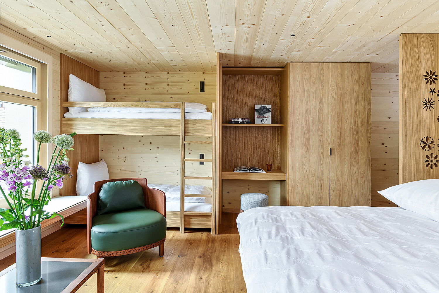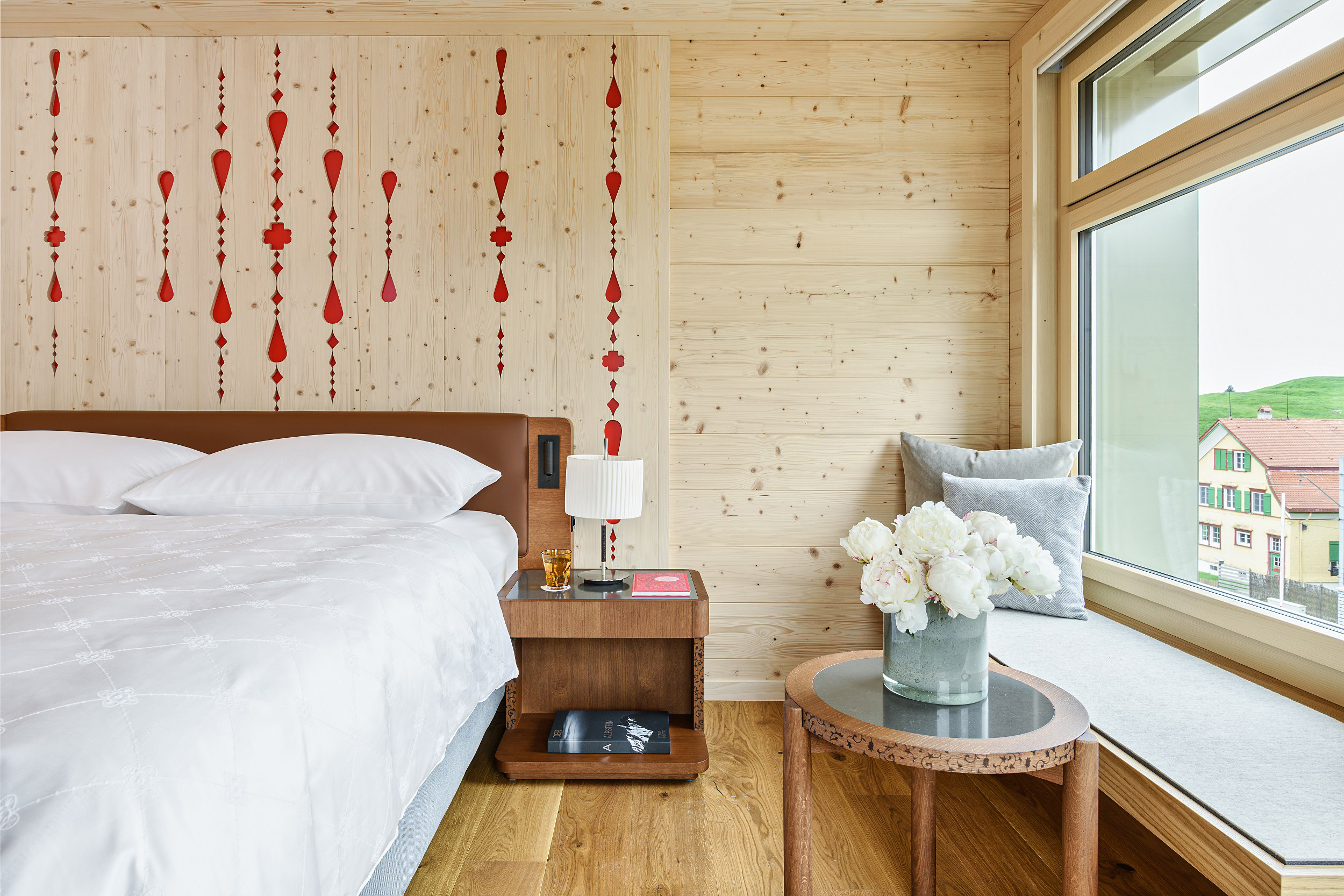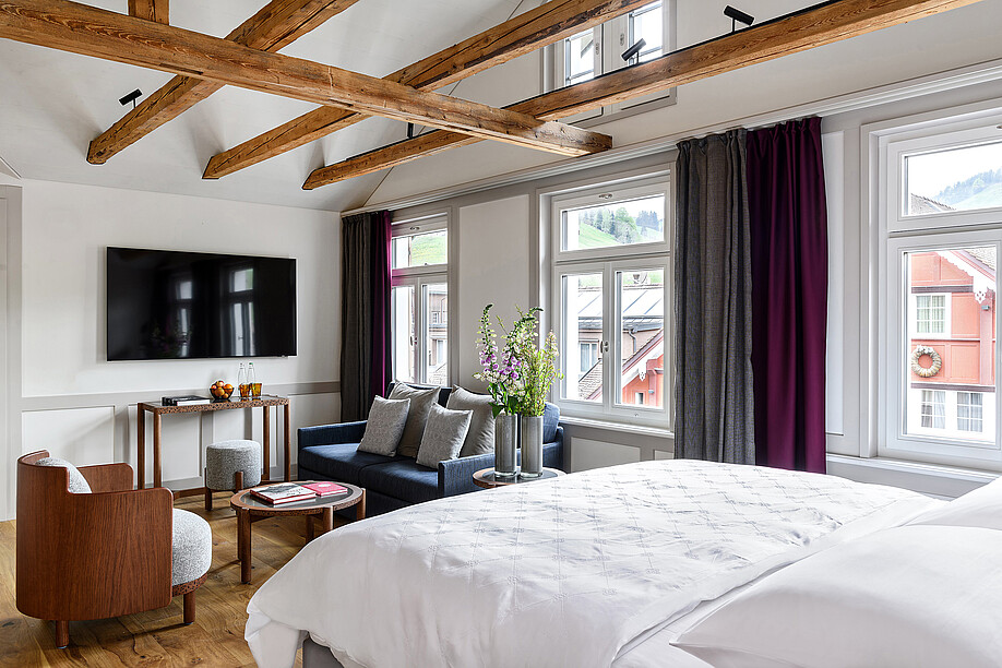 Ruhige, gedeckte Farben mit regionalen Akzenten empfangen den Besucher im neuen Gästehaus. Es gibt 24 Zimmer in drei Kategorien. Wer den historischen Hausteil wählt, profitiert von traditioneller Bauweise und spektakulärer Alpsteinsicht. Man nächtigt in jahrhundertealtem Gemäuer und in der Suite liegt das restaurierte Dachgebälk frei. Die sympathischen Familienzimmer bringen die Eltern im Doppelbett und bis zu zwei Kinder im Stockbett unter. Grosse Fenster und eine lange Bank davor, laden ein, gemeinsam die Berge und die Sterne zu bestaunen.