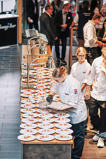 YoungStar startete mit einer Grussbotschaft von Andreas Caminada und einem Einblick in die Welt der Food-Influencerin Judith Erdin aka Streusel. Parallel dazu kochte Niklas Schneider, 15-Punkte-GaultMillau-Koch im Restaurant Paradies in Baden, mit 15 Lernenden ein Gourmetmenü – von Zanderceviche bis Rindshuftdeckel und Kohlrabi Taco. Das junge Küchenteam bewies auch ohne Probelauf: Teamgeist macht Spitzenleistung möglich.